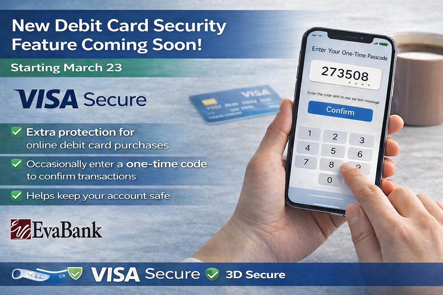 EvaBank is adding Visa Secure to help protect your debit card purchases.